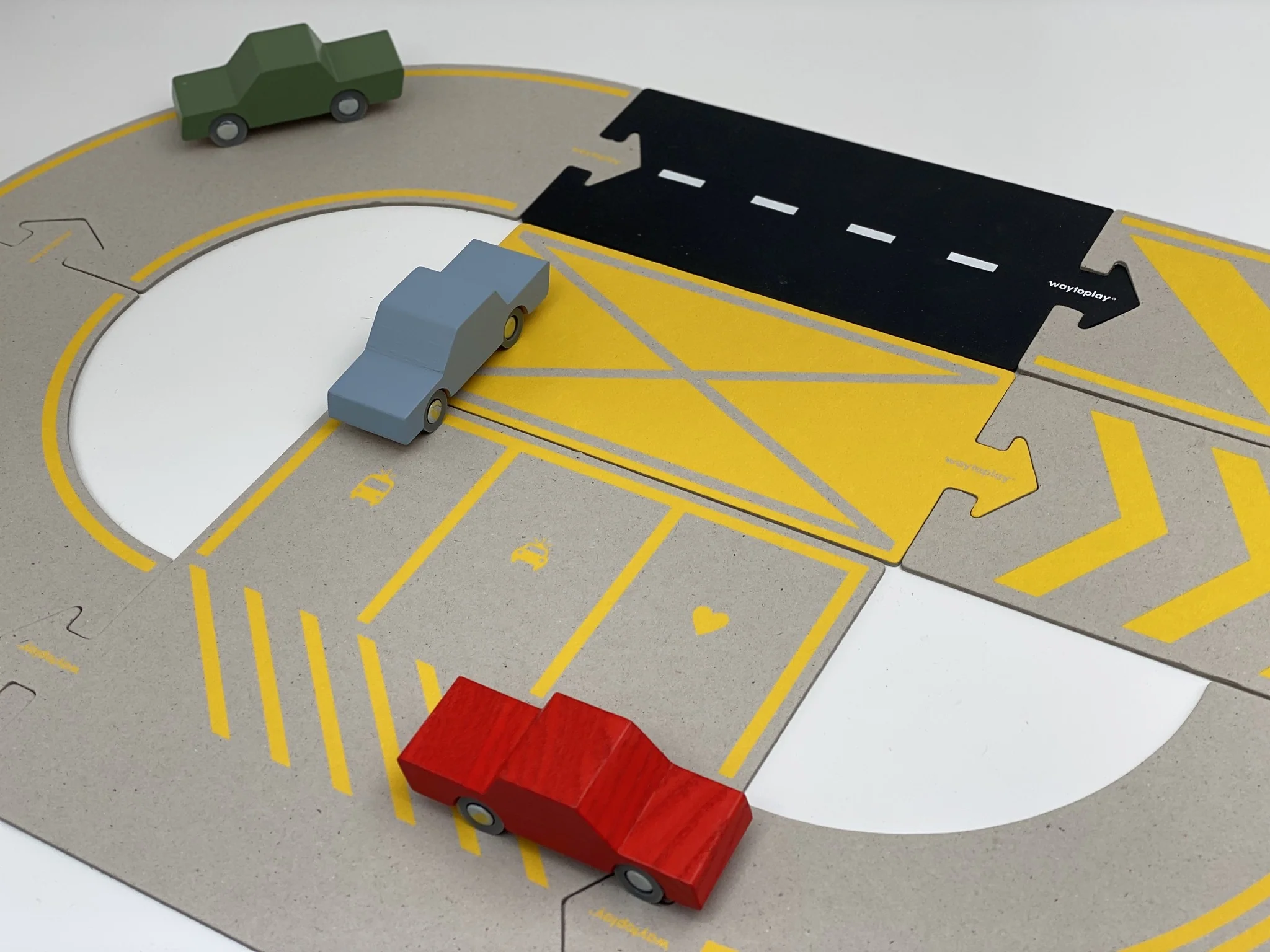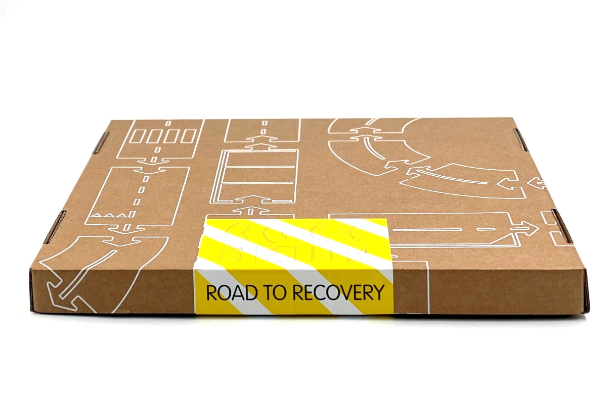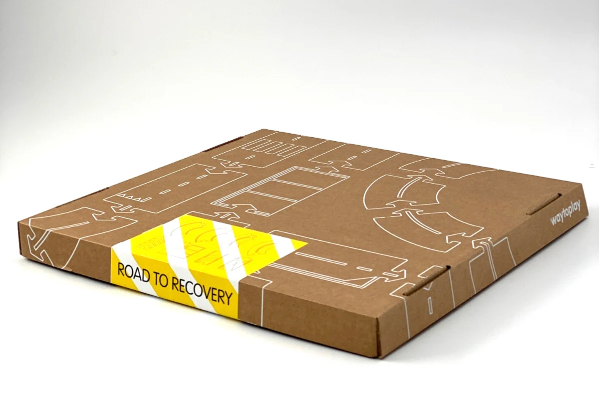 Les sets Road to Recovery sont plus rigides que les sets classiques de Waytoplay, mais le carton s’adapte parfaitement aux rails de voiture flexibles. Le jeu comprend huit pièces en carton avec une impression spéciale. Les longues courbes et le grand parking distinguent ce jeu des circuits automobiles flexibles.